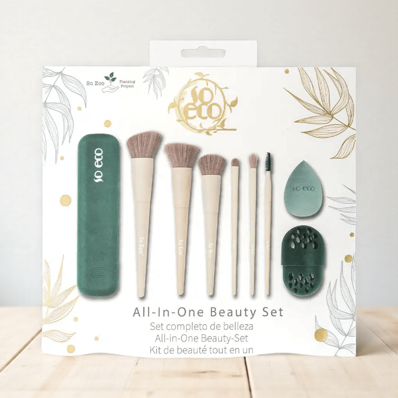 The So Eco All-In-One Beauty Set is the essential toolkit for anyone who wants professional makeup results with tools that are kind to the planet. Thoughtfully curated and beautifully designed, this deluxe collection includes every brush and accessory needed for a polished, seamless makeup routine — from base to brows to eyes.