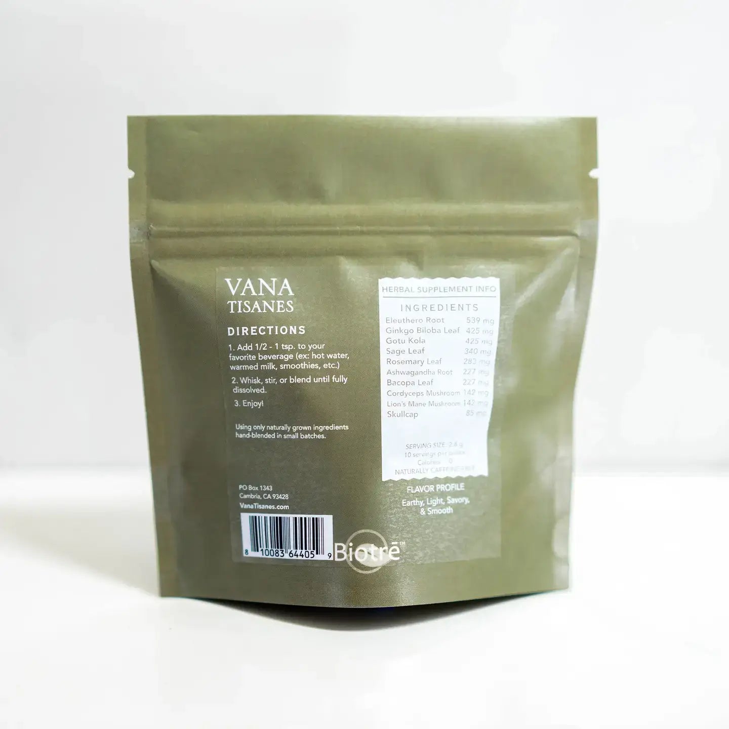 Ashwagandha Root, Bacopa Leaf, Cordyceps Mushroom, Eleuthero Root, Ginkgo Biloba Leaf, Gotu Kola, Lion’s Mane Mushroom, Rosemary Leaf, Sage Leaf, Skullcap