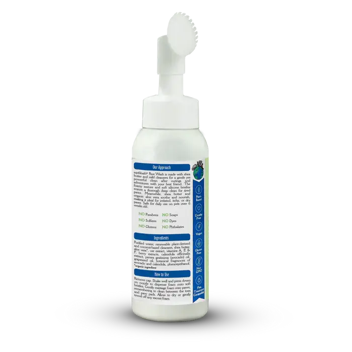 Give your pup’s paws the care they deserve with Earthbath® Paw Wash. This gentle yet powerful foaming wash is made with shea butter, organic aloe vera, oat extract, and nourishing oils to deeply cleanse while soothing and moisturizing tired, itchy, or irritated paws. Soft silicone bristles work the foam between toes and paw pads, ensuring a thorough clean after walks, hikes, or backyard adventures. Safe for daily use on dogs and cats over 6 weeks old.