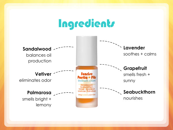 Citrus Sunrise Poetic Pits is a 100% natural, organic deodorant made with sensual sandalwood plus all of the beloved essential oils that suffuse our Seabuckthorn Best Skin Ever: bright seabuckthorn, languid lavender, verdant vetiver, a big burst of sunny grapefruit, and lemony-scented palmarosa.